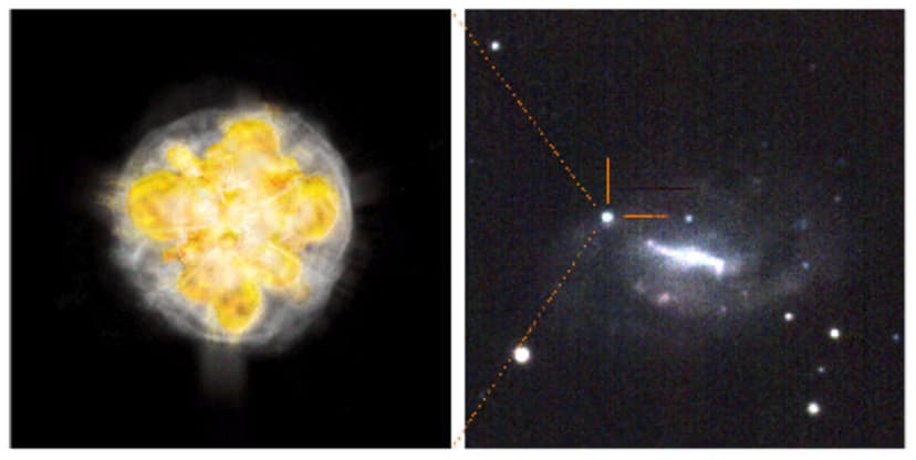 Figure 1: Schematic drawing of the 3D structure (left) and the image of SN 2009mi (right) captured with FOCAS on the Subaru Telescope. This supernova was discovered in the galaxy IC 2151 (in the direction of the constellation Lepas, about 100 million light years away) by Berto Monard in South Africa. (Credit: NAOJ)