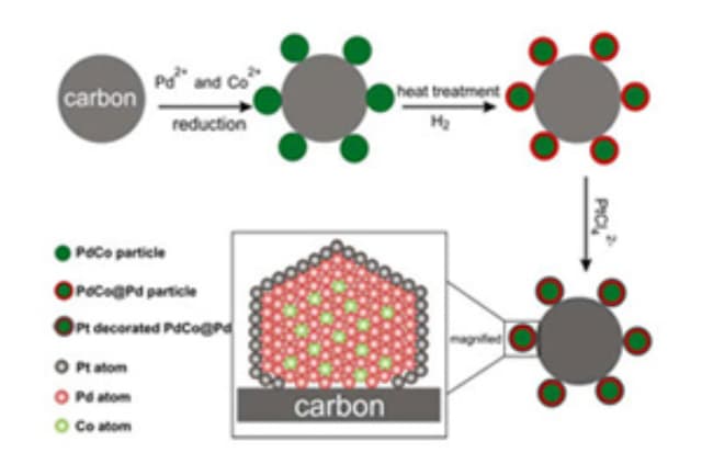 Fuel cells convert chemical energy directly into electrical energy. They consist of an anode, which oxidizes the fuel (such as hydrogen), and a cathode, which reduces oxygen to water. A polymer membrane separates the electrodes. Fuel cell-powered cars in production today use pure platinum to catalyze the oxygen reduction reaction in the cathode side. While platinum is the most efficient catalyst available today for the oxygen reduction reaction, its activity is limited, and it is rare and expensive.