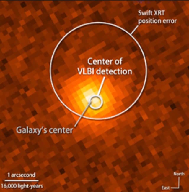 Recently though, on March 28, the Swift X-ray satellite's Burst Alert Telescope, which searches for the short X-ray flare-ups typical of the mega explosions known as gamma-ray bursts, saw a big flare-up but without a following flare-down. An observation with radio telescope arrays then showed a new radio source in the same position, and optical observations revealed the position to be in a distant galaxy. These observations, combined with others from infrared telescopes and Swift's ultraviolet instrument, suggested the new source of all this light was a relativistic jet. Astronomers concluded that they were witnessing birth of a new jet as a result of the supermassive black hole tearing apart a massive star that wandered too close, turning it into an accretion disk of infalling matter onto the black hole.